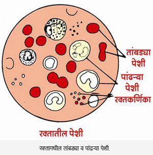 रक्तातला बराच भाग पाण्याचा असतो. याशिवाय रक्तामध्ये तीन प्रकारच्या पेशी व प्रथिने असतात. तसेच ने-आण होणा-या काही पदार्थाचे ठरावीक प्रमाण असते. उदा. प्राणवायू, कार्बवायू, युरीया, साखर वगैरे. रक्तातल्या तांबडया पेशी आणि पांढ-या पेशी वेगवेगळी कामे करतात. तांबडया पेशींमध्ये लोहयुक्त हिमोग्लोबिन (रक्तद्रव्य) असते ते प्राणवायू व कार्बवायू वाहून नेण्याचे काम करते. या रक्तद्रव्याचे प्रमाण दर 100 मि.ली. मध्ये सुमारे 15 ग्रॅम इतके असावे. ते जर कमी असेल तर रक्ताची प्राणवायू नेण्याची क्षमता दुबळी होते. आपल्या देशामध्ये कुपोषणामुळे रक्तद्रव्याचे हे प्रमाण फार कमी आढळते.